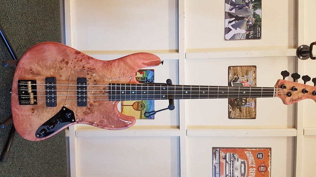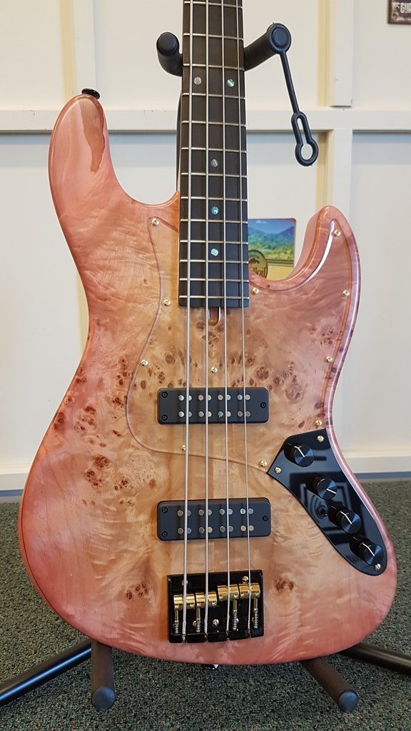 | BODY TOP:BURL POPLAR BODY BACK:ASH NECK:MAPLE 1P FINGERBOARD:EBONY NUT:BONE WIDTH AT NUT:38mm SCALE:34inch RADIUS:310R MACHINE HEADS:GOTOH/GB11W BRIDGE:GOTOH/404SJ-4B PICKUPS :DeviseR/DBP49 PREAMP: Aguilar/OBP-2 CONTROLS:1Vol,1Bal,Treble,Bass,Pre ON/OFF SW FINISH:TOP LACQUER |